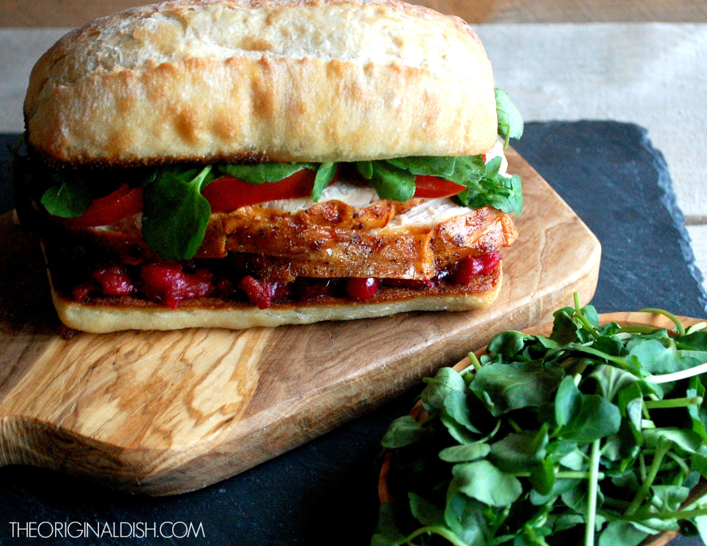 2. In a large sauté pan, heat the oil over medium heat. Slice the ciabatta rolls in half and place each half in the hot oil, cut-side down. Cook for a few minutes until the bread is golden and crisp (work in batches if needed). To assemble, spread a generous amount of cranberry-bacon jam on the bottom half of the roll and Dijon mustard on the top half. Place a few slices of turkey on the jam (I like to heat it up first). Next, layer the sliced tomatoes on top of the turkey, seasoning with salt and pepper. In a small mixing bowl, add the watercress and season to taste with lemon juice, olive oil, salt, and pepper. Top the tomatoes with the seasoned watercress and close the sandwich. Cut in half and enjoy!