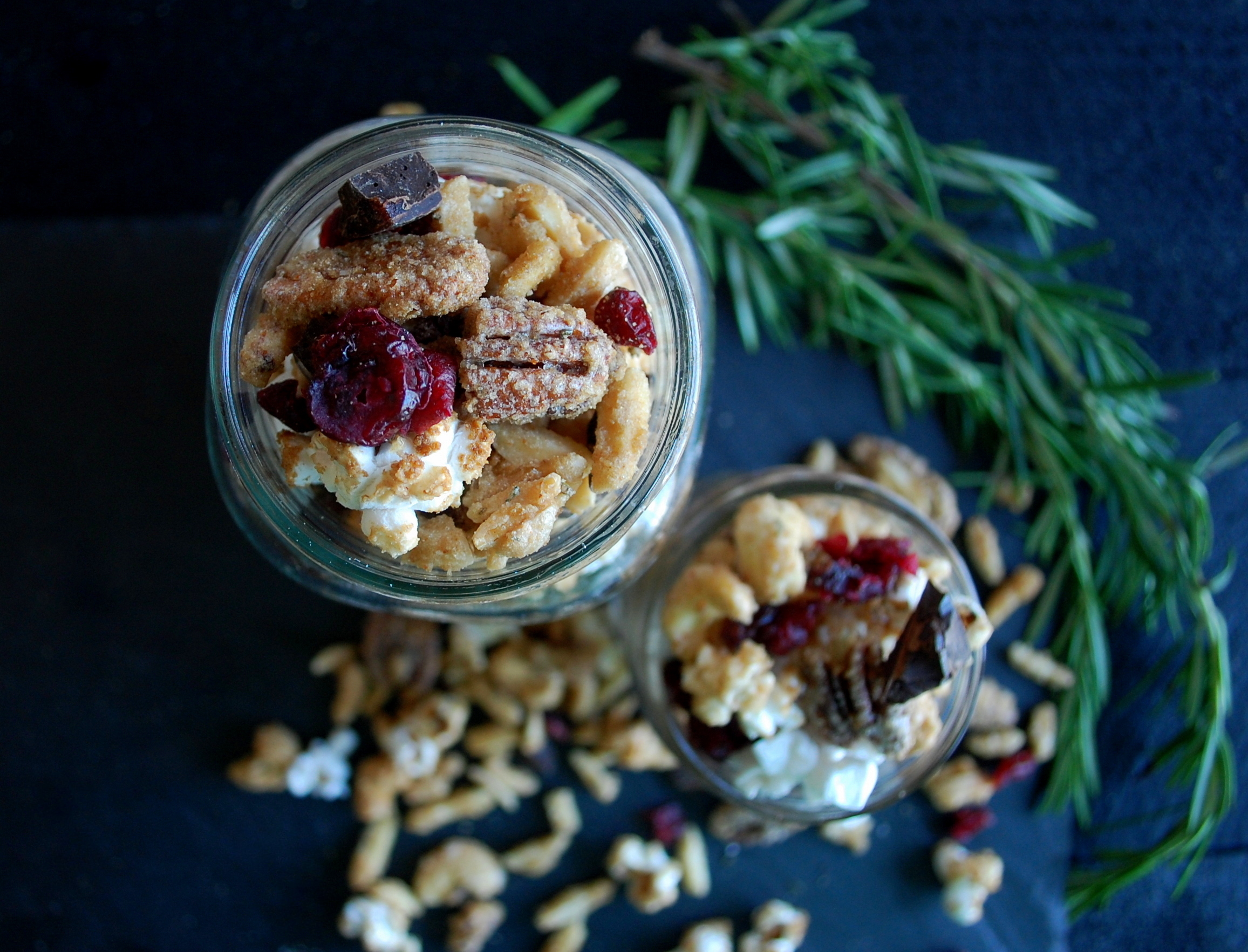 a festive mix of candied nuts, popcorn, dark chocolate, dried cherries & rosemary