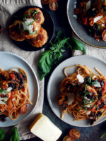 From there, you’ll dredge the pork chops in 3 steps: first through flour and salt, then through eggs beaten with maple syrup, and finally through a panko breadcrumb, pecan, and black pepper mixture. The chops get cooked for a couple minutes per side until golden (keep a close eye so the crust doesn’t burn) and then baked in the oven until just cooked through. Results in juicy, extremely tasty pork every single time.